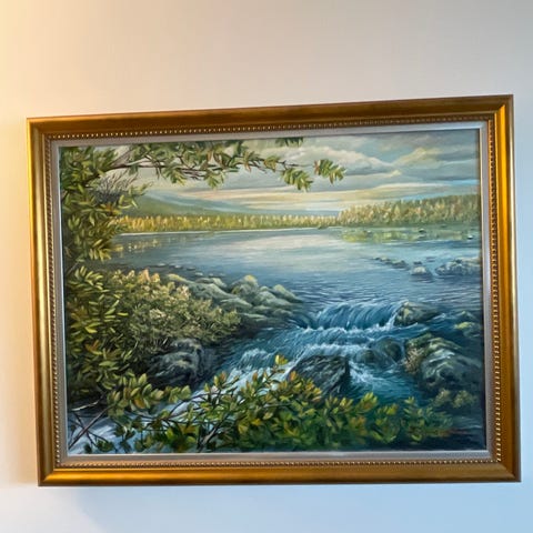 Nikolai Nelivuon maalaus, jossa on useita ihmishahmoja sisätilassa. Teos on kehystetty ja siinä on oranssin, ruskean ja vihertävän sävyjä. Takapuoli on kuvattu toisessa kuvassa, jossa näkyy maalauspohjan rakenne.