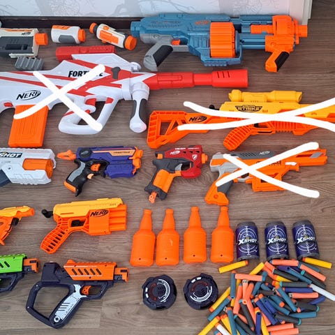 Neljä Nerf-asetta ja panoksia. Toimivia.