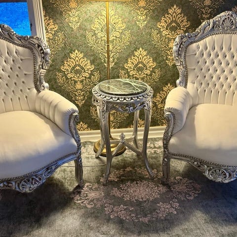 Ostitko juuri kartanon, mutta huonekalut puuttuu? Tässä pakettiratkaisuna valmis setti antiikkihuonekaluja noin 1910-1920-luvuilta. Tyylisuunta Jugend, jos se sattuu kiinnostamaan. Sohva on varsin moderni ikäisekseen, sillä se muuntuu sängyksi, tai ainakin se on levitettävä, sillä sen käsinojat kaatuu. vuodesohvan mukavuuteen en ota kantaa.