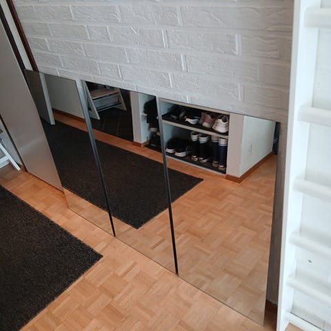 Kymmen kappaletta 20x20 cm peilipintaisia levyjä. Ovat muovia, ei lasia, eli tosi kevyitä. Peilissä pinkki/ruusukultainen sävy, muovikalvot on paikallaan suojaamassa pintaa. Takana ei mitään tarroja tai liimoja vaan saa itse keksiä millä kiinnittää.