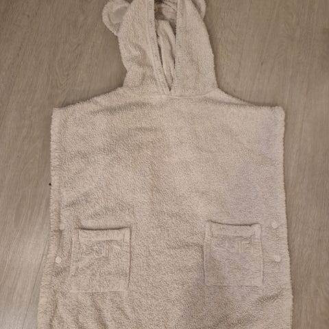 Kermanvalkoinen tai luonnonvalkoinen laadukas kylpytakki Dantelli merkiltä. Pehmeä puuvillainen. Kylpytakin vyö on sivusaumoista kiinni takissa ja takaosassa on leveä kuminauha ommeltu takin sisään. Eli ei häviä tai tipu vyö, eikä roiku toinen puoli pitempänä kuin toinen. Hyvä huppu. Pari taskua. Käytetty ainoastaan kun käyty lähirannalla uimareissussa.