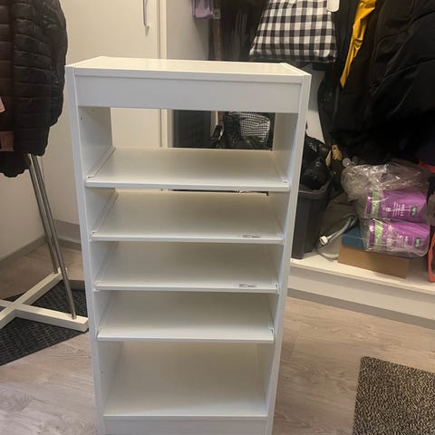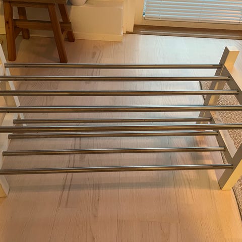 Käyttämätön mutta vanha Ikean hylly. Alunperin myyty kenkähyllynä, mutta oli aikoinaan muotia käyttää lehtitelineenä.