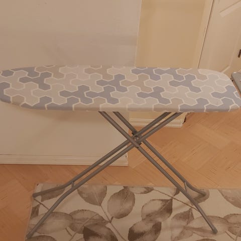Silityslauta, perinteinen malli ja vähän käytetty. Siisti suojus. Laudan päässä ulosvedettävä silitysraudan laskutaso - näkyy kuvassa huonosti.