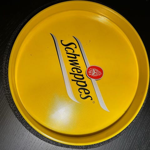Kauniin sininen 8-kulmainen Tarjotin, kovaa muovia, jossa käden reijät, halk. 34.5 cm, ehjä.