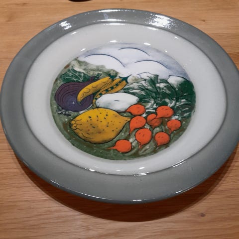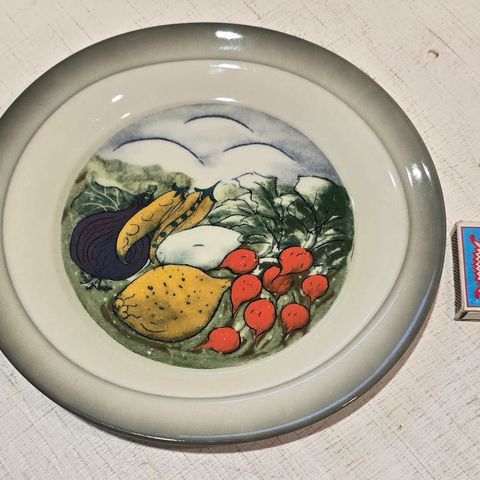 Heljä Liukko-Sundströmin Salaatti syntyy -koristelautanen. Halkaisija noin 25,7 cm. Kunto hyvä. Lähetys tai nouto.