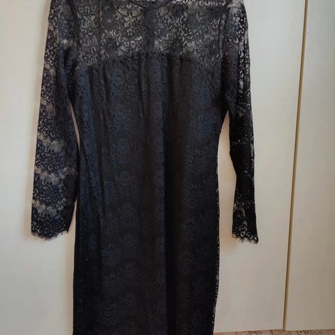 Musta kotelo mekko valkoisilla kiemuroilla. Koko 40.