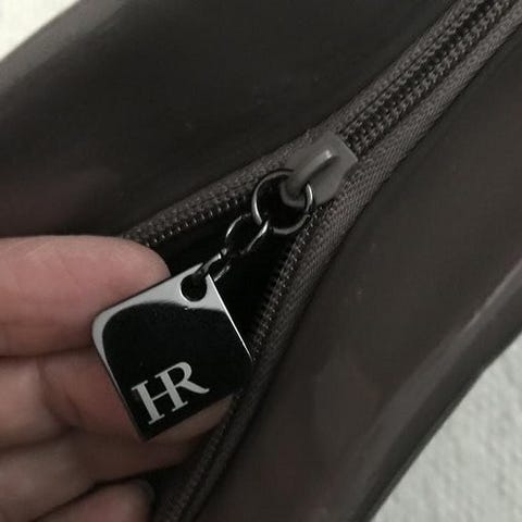 Helena Rubinstein kullanvärinen hohtava meikkipussi / iltalaukku, mitat n. 20 cm x 12,5 cm x 3 cm. Uudenveroinen, ei ole ollut käytössä.