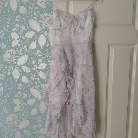 Suloinen perhoskuvioitu mekko / kesämekko. Asustettuna käy myös juhliin, esim. rippimekko. Siisti käytetty. Koiratalous.