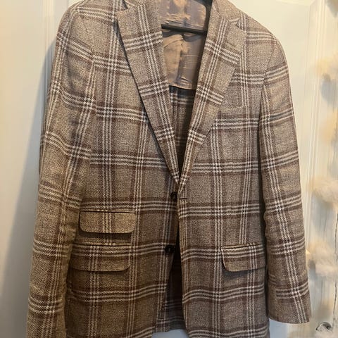 80 % polyesteri + 20 % silkki. Siistikuntoinen, vähällä käytöllä ollut. Puvun housuja ei enää ole.