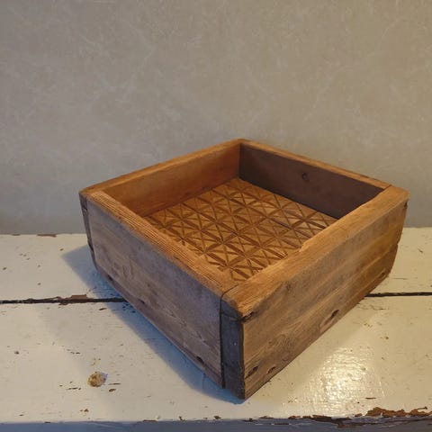 Vanha 50-60 lukuinen ja hyväkuntoinen juustomuotti, joka on ollut mummillani käytössä. pituus 19cm