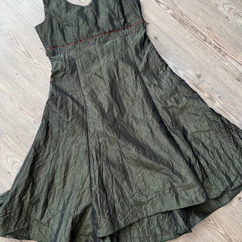 Kauniskuosinen laadukas Suomessa tehty mekko. Vuorellinen. Tazzia merkiltään. Hihaton. Kaupan päälle läpinäkyvä vihreä bolero.