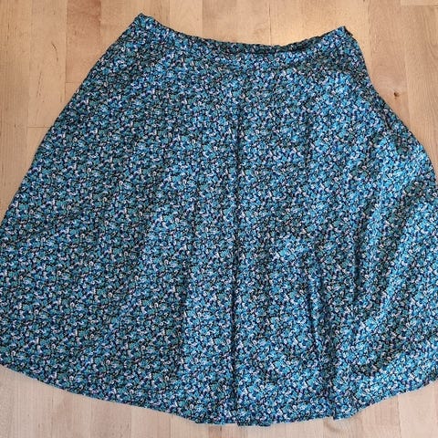 Puuvillainen alushameellinen hame, jossa ruskea satiininauhainen rusetti. Vasemmassa sivusaumassa toimiva piilovetoketju pukemista helpottamaan. Kokomerkintä L, mutta itse suosittelisin ennemmin S- tai M-kokoiselle. Muutama pieni tahra edessä, eivät kuitenkaan juuri näy käytössä.