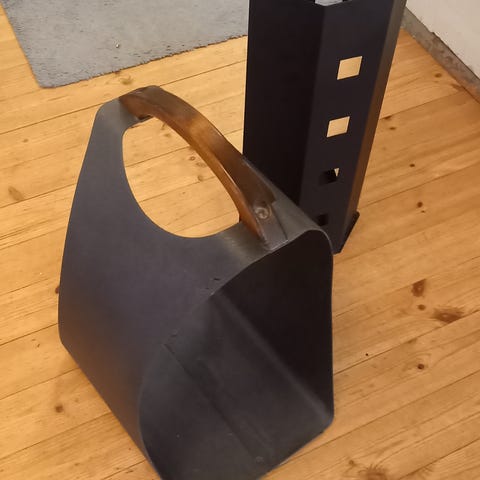Metallista tehty jämäkkä puukantoteline. Koristeelliset jalat.