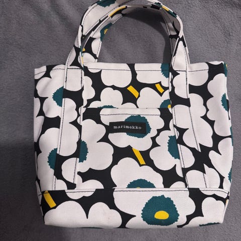 Peruskassi-laukku on valmistettu Pieni Unikko-kuosisesta paksusta puuvillamarkiisista. Laukussa on kaksi tukevaa kantokahvaa ja paljon tilaa.