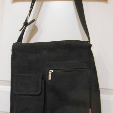 Musta olkalaukku pitkälä ja lyhyellä hihnalla, paljon taskuja, keinonahkaa, hinta 5 euroa + postikulut