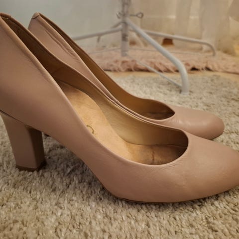 Käyttämättä jääneet huippulaatuiset korokepohja-avokkaat mokkaa, kamelinruskea. Sisäpuoli pehmeää nahkaa. Tolppakorko 9 cm, korokepohja 2 cm. Ovat siis korosta huolimatta mukavat kävellä. Ainoa moite nälytystarrasta jäänyt jälki toisen kengän sisäpohjassa. Pohjan lika vain sovituksista. Klassinen, mantelinmuotoinen kärki. Sisämitta n. 24 cm.