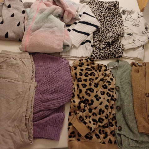 Kuvanmukainen tyttöjen vaatepaketti eli vetoketjullinen collegepusakka, pitkähihainen, t -paita sekä farkkuleggarit, joissa lahkeensuissa vetoketjut. Koot 134-140 cm.