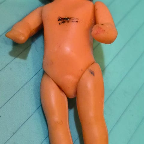 Suloinen Ari-nukke jolla paita ja pöksyt. Liima tullut parista kohtaa kankaasta läpi.