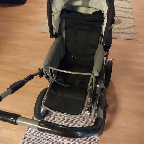 Päivävarjon pidike vaunuihin. Keskellä kääntyvä nivel, millä voi vaihtaa varjon asentoa.