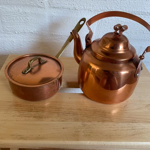 Skultuna kuparinen kahvipannu, tilavuus 2 litraa. Väri kuparinruskea, korkeus 17 cm. On lommoilla mutta muuten kohtalaisessa kunnossa.