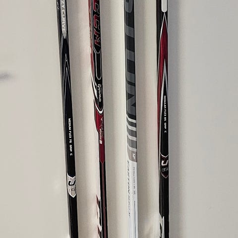 - kaksi punaisen väristä 150 cm pitkät, CCM Octo Gun regular flex grip ja Bauer Endure ultra premium composite system, pro flex 102, paino 475 g;