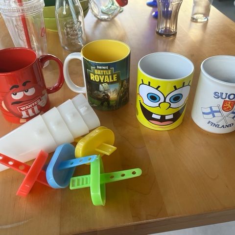 Design by Åsa Lindberg Sweden, valkoinen, korvallinen Muki, jossa Suomi teksti ja Suomi liput, kork.11 cm ja suun halkaisija 7.7 cm, ehjä.
