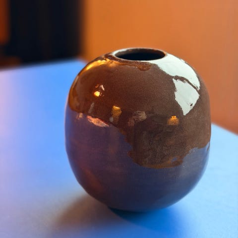Pyöreä maalattu ruskea saviruukku, jossa pohjassa signeeraus ”M Kisko”? Pieni halkeama yhdellä sivulla, joka näkyy kuvassa (3.). Voi kääntää pois katseista eri suuntaan. Korkeus 10cm ja halkaisija päältä 23cm.