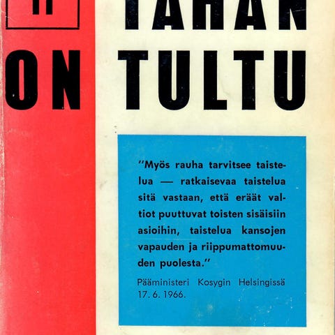 Paasikiven linjalta K-Rintamaan, 5.painos, "Myös rauha tarvitsee taistelua-ratkaisevaa taistelua sitä vastaan, että eräät valtiot puuttuvat toisten sisäisiin asioihin, taistelua kansojen vapauden ja riippumattomuuden puolesta." Pääministeri Kosygin Helsingissä 17.6.1966.