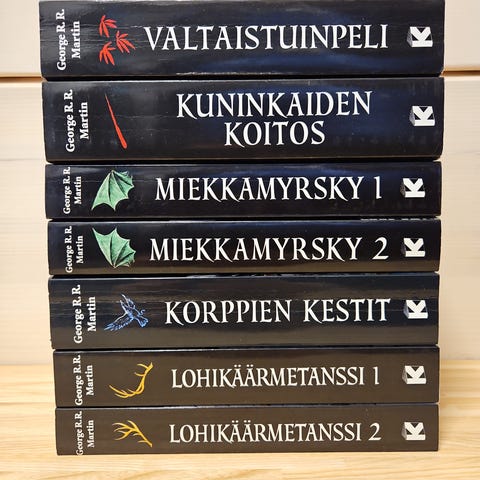 Koko sarja, hinta 10e/kpl. Muuten hyvässä kunnossa mutta Feast for Crows selkäpuoli on vähän kärsinyt ja korjattu liimalla, ja lisäksi Game of Thrones ja Storm of Swords osa 1:n kansista hieman kuoriutuu kansien reunasta jotain muovikalvoa.