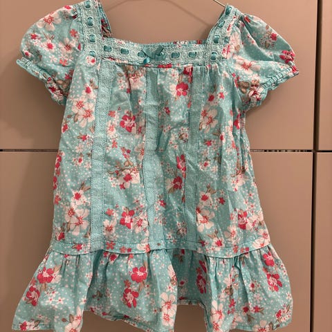Myydään kukallinen puuvillatunika satiininauhakoristein. Koko 128 cm, kunto erinomainen. Voin postittaa.