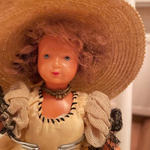 - Tunnistamaton pikkuvauva-nukke, n.5,5cm pitkä, puettu nuttuun (vaate kuluneen oloinen, vuosikymmenten saatossa tummunut), pää, kädet ja jalkapohjat maalattua kovaa massaa, raajat pehmeitä ja liikkuvat . Saattaa olla lahja/tuliainen Ranskasta n.1950-60-luvulta, 8eur