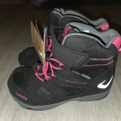 Siistit Treksta core-tex mustat talvikengät. Sisus on väriltään liilaa/Marjapuuro. Tarrat toimii ja lisäkiristys pikalukolla. Kantapäässä heijastimet. Kenkien kärjessä hieman kulumaa. Koko 32. Hinta 20e.