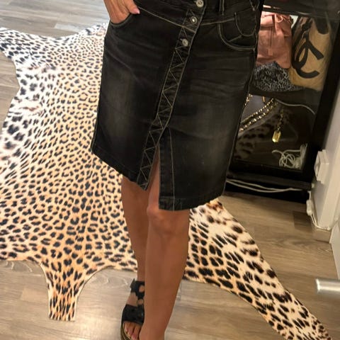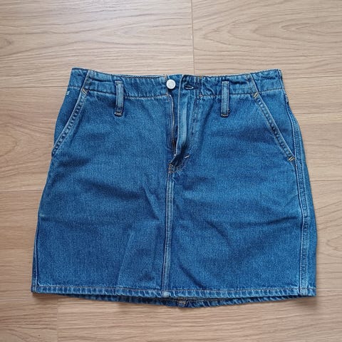 Vaalea, napakkakuntoinen Esprit- merkkinen farkkuhame. Mitat: vyötärö 90 cm, pituus 43 cm.