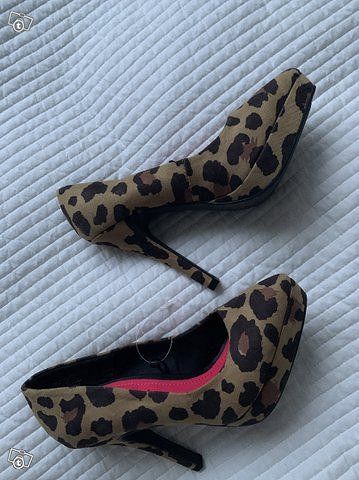 Hurayln mustavalkoiset koon 36 todella kauniit ja ihastuttavat leopardikuvioiset korkokengät AITOA NAHKAA! (Pohjissa merkinnät!) Korot n. 10 cm. Kärjissä leopardi kuviodut "shifonkirusetit" strassireunuksin. Uudenveroiset kaikinpuolin, myös pohjista ja korkolapuista, KTS. KUVAT! :)