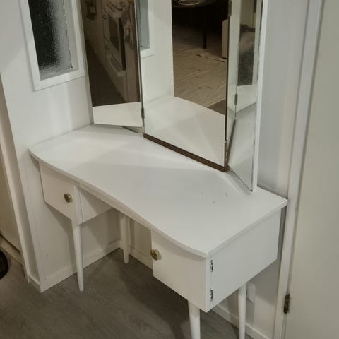 Kuvan pikantti umpipuinen peilipöytä sekä jakkara