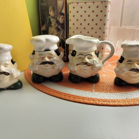 Tosi vanhat antiikkiset, kaksi kappaletta pieniä kermakkoja / kermakannuja ja yksi kannellinen sinappipurkki