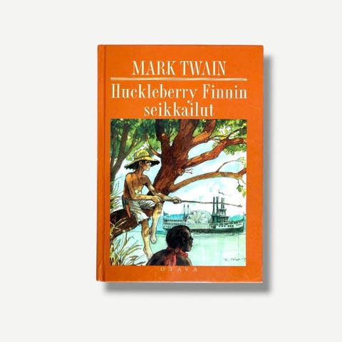 Huckleberry Finns äventyr bok. Mark Twain. Illustrationer av Gunilla Edelstam. Slitage på pärmen och lite fläckar. Sidorna i gott skick, men vissa sidor har fläckar.