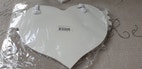Valkoiseksi maalatut puiset sydämet, joiden yläpuolella köydellä puinen panneri.