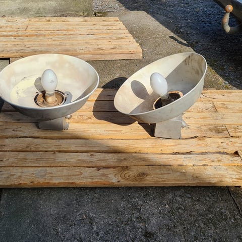 Kahdeksan kappaletta valaisimia. Valaisimen halkaisija 49 cm ja korkeus 38 cm. Varjo alumiinia ja lampun kanta E27. Hinta per kpl, useamman hinta neuvotellaan. Voin hankkia lamppuihin lopun varustelun ( johto, vaijeri, vaijerilukot ja yläkuuppa) . Sovitaan ostajan kanssa.