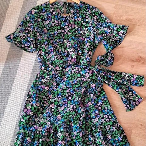 Myydään kukkamekko, jossa vyötärön alapuolella rimpsut. Koko M. Ympärysmitta kainalon alta 106 cm, vyötärön ympärys 96 cm, lantion ympärys 104 cm. Mekon pituus 94 cm. Edessä napit lantiolle asti. Materiaali puuvillaa. Hinta 8,- lisäksi Toridiili toimitusmaksu.