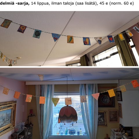 Pienoislippuja (40 cm x 60 cm). Muovia, vasemmassa laidassa narukäytävä. Kaikki 4 kpl yhteensä ilmoituksessa mainittuun hintaan.
