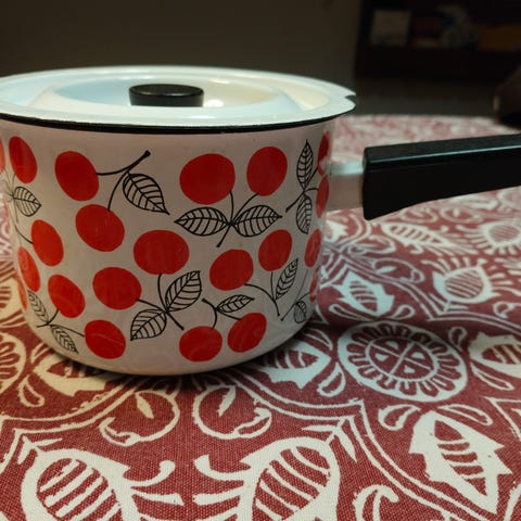 Hyväkuntoinen punainen Ester Tomulan Finelille suunnittelema kasari, jossa kannessa pienenpieni emalilohkeama ja kahvassa lohkeama.