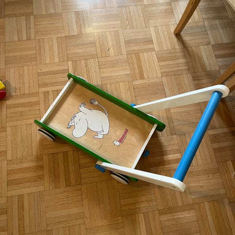 Hieno lasten perässävedettävä Muumi ostoskärry pyörillä. Vetokahvan voi laittaa myös sisään, niin voi kantaa myös selässä.