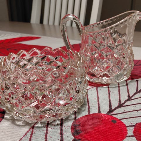 Kauniin sininen tarjoilupari, kermakko ja sokerikko vanhaa lasia. Ehjät ja siistit.
