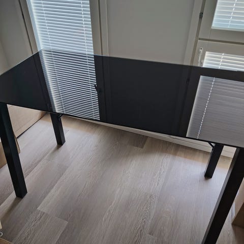 Hyväkuntoinen tukeva ja painava lasipöytä metallijaloilla. Pituus 150 cm, leveys 80 cm, korkeus 74 cm. Kuljetus pääkaupunkiseudulla onnistuu.