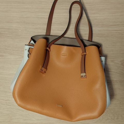 Vuoritettu, sisällä vetoketjullinen tasku, myös laukun takapuolella.