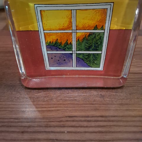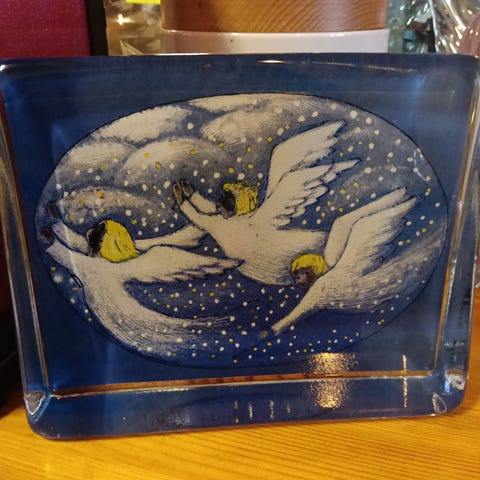 Iittalan lasikortti. Tarra tallessa. Ihan pieni kuluma kissan korvan yläpuolella näkyy viimeisessä kuvassa, kuva otettu takapuolelta.