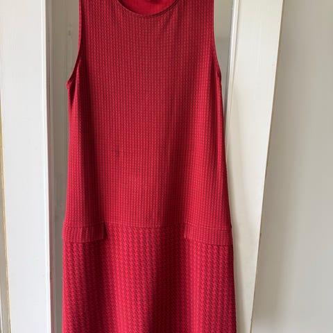 Taattua tunnelmaista laatua, joka ollut kohdallaan kotimaisissa Nanson mekoissa jo 1980 luvulta ja edelleen kuin uusi. Punainen kultavärinapeilla koko 36. Kainalo-kainalo 47 cm ja olka-helma 114 cm. Melko suora malli mutta hieman alaspäin levenevä ja alhaalla on laskos.