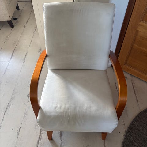Hyvässä kunnossa oleva Iskun nojatuoli. Tuolin puuosat ovat koivua.