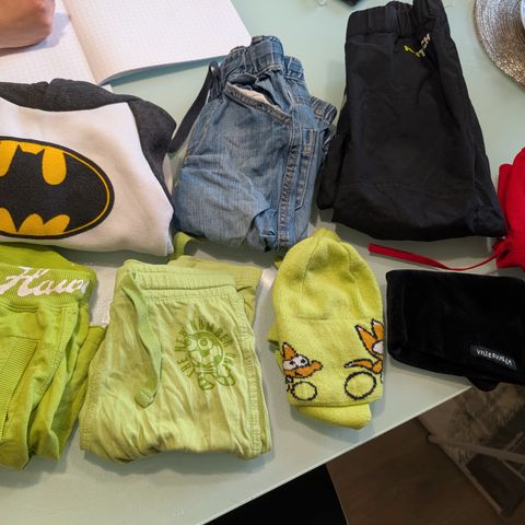 Kaikki hyväkuntoisia vaatteita: farkut, samettihousut, collareita, pitkähihaisia, lakkeja, sukkia.